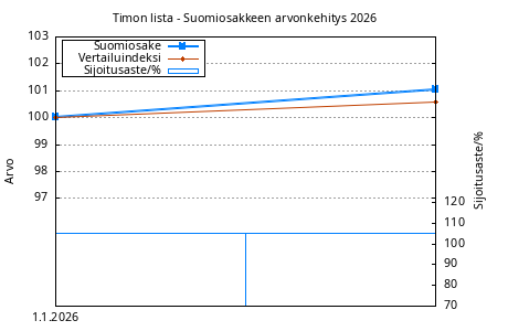 Alla Timon lista - Suomiosakkeen ja vertailuindeksin kehittyminen (hallinnointi- ja tuottosidonnaisen palkkion jälkeen) ja sijoitusaste (osakkeisiin sijoitettu osuus salkun varoista).