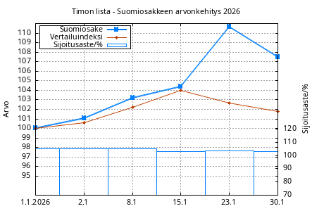 Alla Timon lista - Suomiosakkeen ja vertailuindeksin kehittyminen (hallinnointi- ja tuottosidonnaisen palkkion jälkeen) ja sijoitusaste (osakkeisiin sijoitettu osuus salkun varoista).